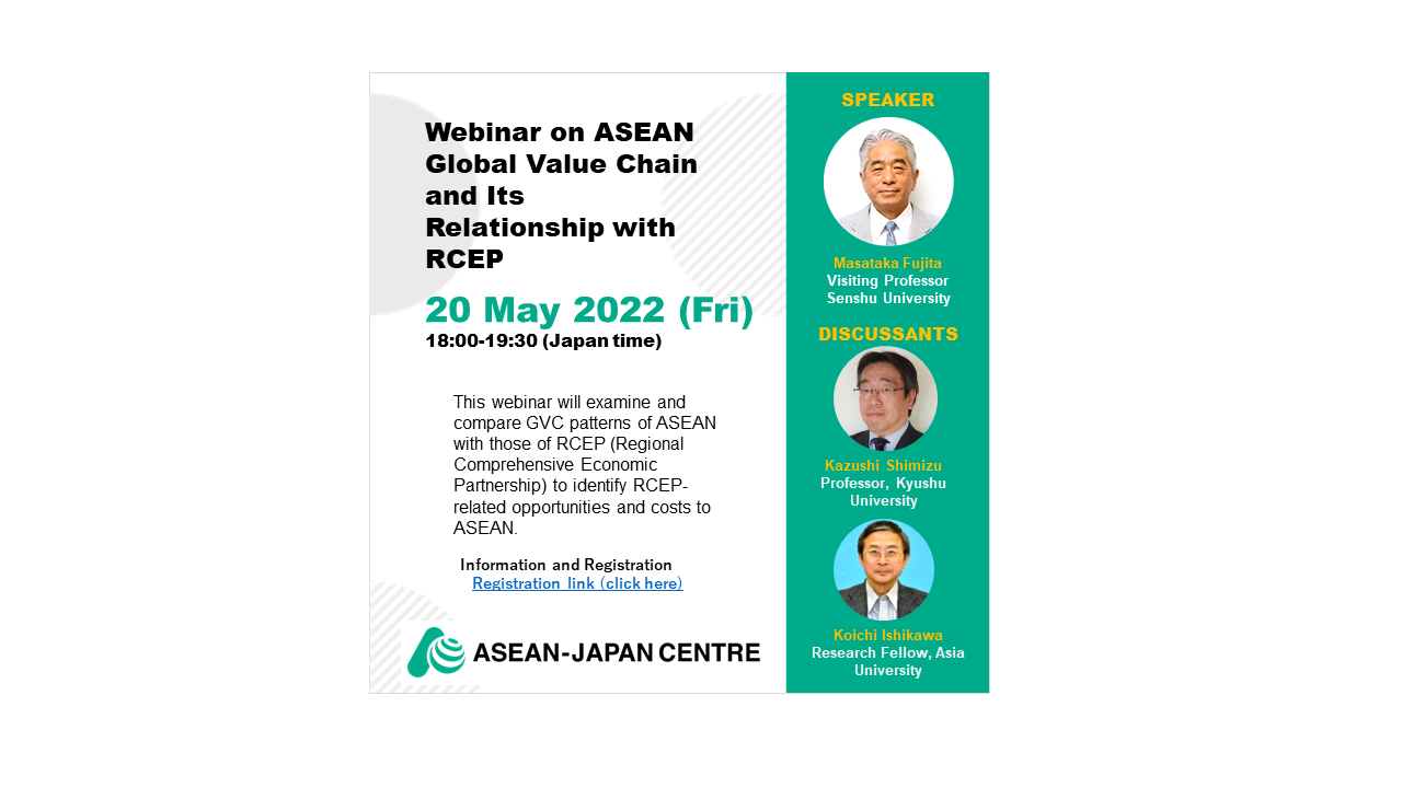 The ASEAN-Japan Centre, an international organization will hold the webinar based on the Centre’s recent publication entitled “ASEAN Global Value Chain and Its Relationship with RCEP: Impacts of RCEP on ASEAN Integration”. The webinar will examine and compare GVC patterns of ASEAN with those of RCEP (Regional Comprehensive Economic Partnership) to identify RCEP-related opportunities and costs to ASEAN. The webinar will welcome interested participants from micro, small and medium enterprises in ASEAN and Japan, multinational companies, government representatives, business associations, academics, and anyone with interest on ASEAN GVCs and RCEP.